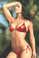 ぬれると透けるセクシー水着。トップは首の後ろと背中で結ぶ三角ビキニ。ボトムはおしりがほぼ隠れるブラジリアンスタイル(写真はT…