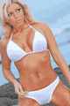 手編みニットのセクシービキニ。ホルタートップで、首の後ろと背中で紐を結んで留めるデザイン。ボトムはブラジリアンスタイルで、両サイドを結んで留めるデザイン。股部分にのみ裏地付き。100% Cotton。