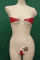 ゴールドラメのマイクロビキニ。トップは炎の形で最大幅6.5cm。細いゴールドのゴムストリングを首の後ろと背中で結んでとめるスタイル。Tバックのボトムは両サイドが2本の細いゴムストラップです。85% Antron Nylon, 15% Lycra。