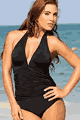 Halter style, Ties at neck, Shirred bustline, Scoop back, Low cut legs, Full rear coverage, Fully lined, Matte Bla…