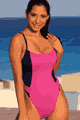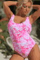 Dipped in the front and back, High cut legs, Full rear coverage, Shelf Bra, Fully lined, Pink Hawaiian Nylon/Lycra…