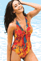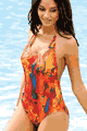 Fully lined one−piece swimsuit with plunging halter neckline with adjustable lace−up front, adjustable side ruchin…