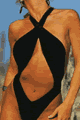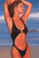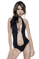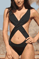 セクシーなワンピース水着。パンティにサスペンダーが付いたようなイメージのデザインで、タスキのように左右をクロスさせて着用します。バスト部分にパッドはありません。パンティ部分は前後ともV字スタイルに…