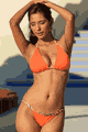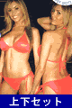 ビーズ付きのクロスストリングがお洒落なデザインビキニ。トップはバンドゥスタイルで、ネックはダブルのストリングを結んで留めるデザイン。両サイドに縦のワイヤー入りで、取り外しのできるパッド入り。バックはゴールドの花形フック付き。ボトムはフロントがVカット…