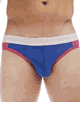 コントラストカラーのライン入りブリーフ。ウエストのゴムバンドにはメーカーロゴのプリント付き。前開きではありません。90% Cotton, 10% Lycra。