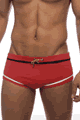 赤の無地のメンズビキニ水着。フロント部分はポーチ部分が膨らんだデザイン。ポーチ部分のみ裏地付き。100% Nylon。
