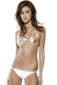 Front lined for swim. 塩素に強い素材使用。大きなリングの付いたストリングビキニ。トップは首の後ろと背中で紐を結んで留めるスタイル。裏地付きで、パッドはありません。ボトムは両サイドを紐で結んで留めるスタイルで…