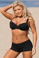 Top is Underwire cups, Shirred panels, Removeable padding, Wide straps, Back hook closure. Bottom is Banded Waistb…
