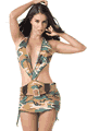 カモフラージュのホルタートップとハイウエストスカートのセット。トップはバックにフック付き。ネック紐に襟が付いたデザインで、襟にパッチと星のシルバーアクセ付き。スカートはバックファスナー付きで、片側のみポケット付き。ゴムバンドのベルトはマジックテープで…