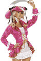 ゴージャスなピンクのパイレーツキャプテン。レースドレス、ハット、レースアップコート、アイパッチ、剣のセットです。レースドレスはチューブスタイルで、フロントトップと裾にラッフル付き。裏地はありません。ジャケットは小花模様のペナントサテン生地で、ゴールド…