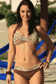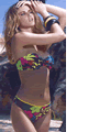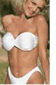 ビーズ付きのクロスストリングがお洒落なデザインビキニ。トップはバンドゥスタイルで、ネックはダブルのストリングを結んで留めるデザイン。両サイドに縦のワイヤー入りで、取り外しのできるパッド入り。バックはゴールドの花形フック付き。ボトムはフロントがVカット…