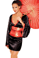 Parasol LEM9423.日本人形コスチューム。光沢のあるブラックのサテン生地に美しい刺繍の入った赤の縁取り付き。バックにファスナーが付いたドレスになっています。帯が別に付いていて、11段のフックで留めるようになっています…