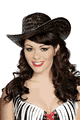 Bra top, zip front skirt with built−in petticoat, thong, badge and cowboy hat set. ブラックライトの中で光ります。