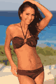 Front gold ring, Ties at neck, Hooks at back, Fully lined, Brown/Tan Nylon/Lycra fabric. High cut waistline, Low c…