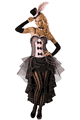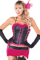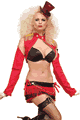Underwire bra, fringe garter skirt, shrug with garter strapped sleeves and whip.