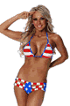 メタリック生地のゼブラ柄のセクシーなホルターネックビキニセットです。トップは首の後ろと背中で結んでとめるトライアングルスタイル。胸元とウエスト部分にスタッズ(鋲)が付いたレザー風生地の飾りベルト付き。写真のチョーカーとブレスレットは商品に含まれていま…