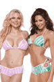 Stretch tricot. Swim safe. Front lined.大きなリングの付いたストリングビキニ。ミントブルー×ブラウンの模様がオシャレなビキニです。トップは首の後ろと背中で紐を結んで留めるスタイル。裏地付きで…