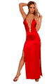 全体に小さなメタリックのキラキラ光るドットがついた生地のロングガウン。写真よち落ち着いた赤です。胸元が大きく開いたセクシーなデザインで、センターにはラインストーンを使ったゴージャスなジュエリー付き。首からぶら下げるホルタースタイルで、ストラップ部分は…