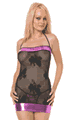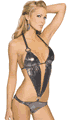トップと裾がメタリックラメになったフィッシュネットドレスと同色のラメのThong(T−Back)パンティのセット。ドレスのフィッシュネット部分には蝶の模様入り。首の後ろと背中で結んでとめるデザインで、背中側は大きく開いています。80% Nylon, …